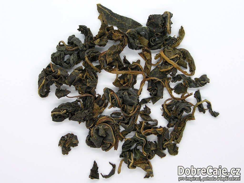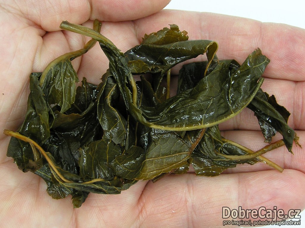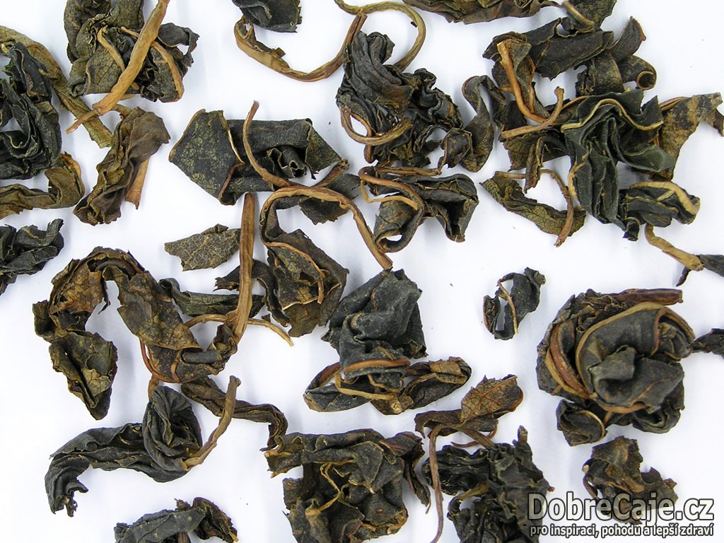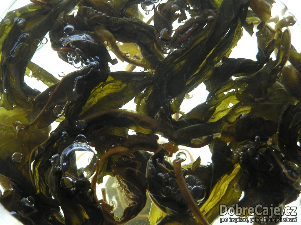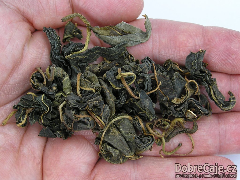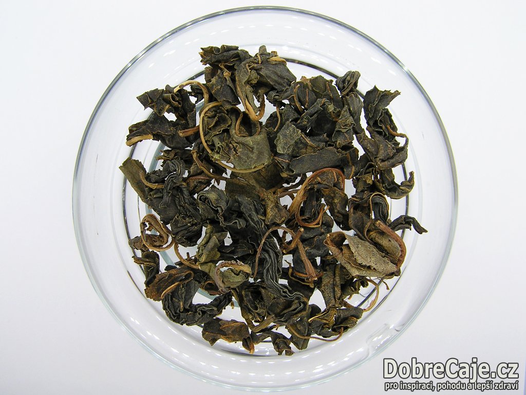 suchý čaj: volné, dlouhé, do smotků rolované hnědé až hnědozelené listy se sladkou květinově višňovou vůní