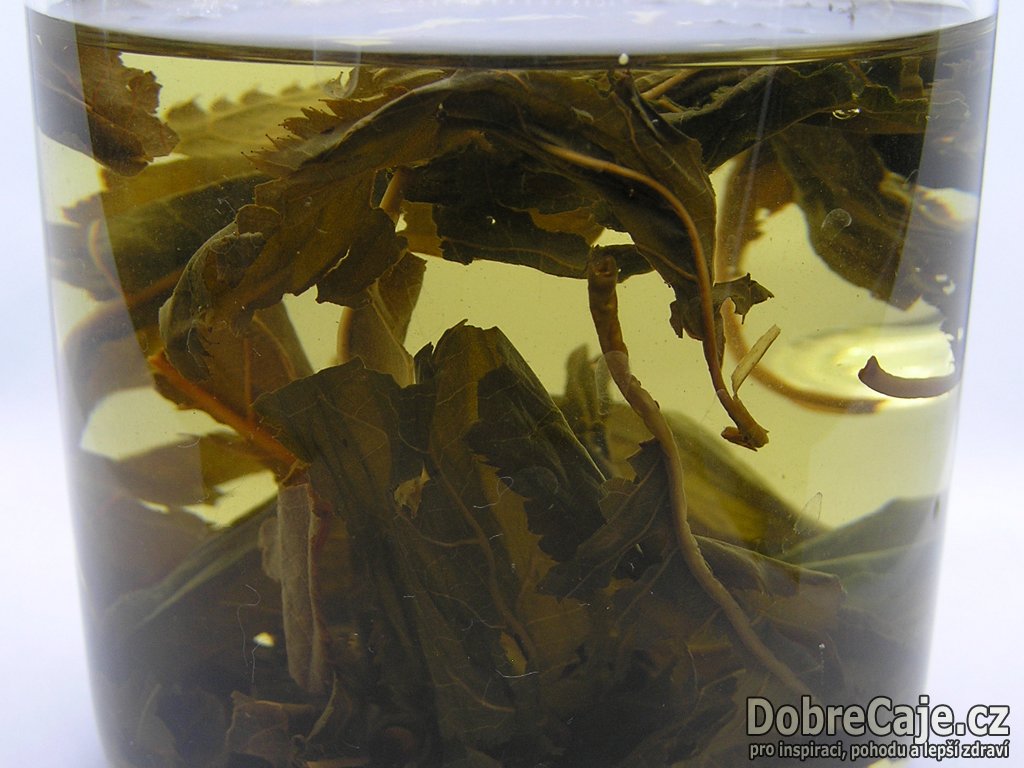 vyluhovaný čaj: rozměklý avšak tužší, rozvinutý , převážně celý list