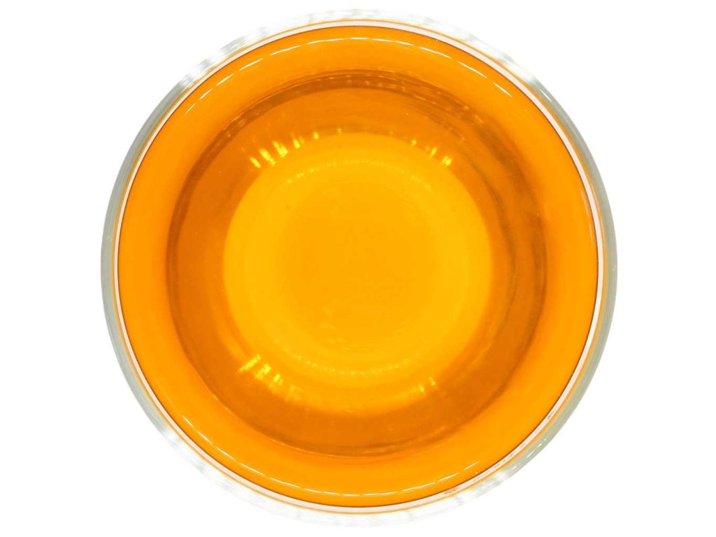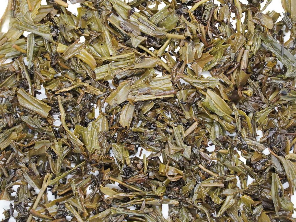 vyluhovaný čaj: tmavě, temně zelenohnědý list, s praženými tóny