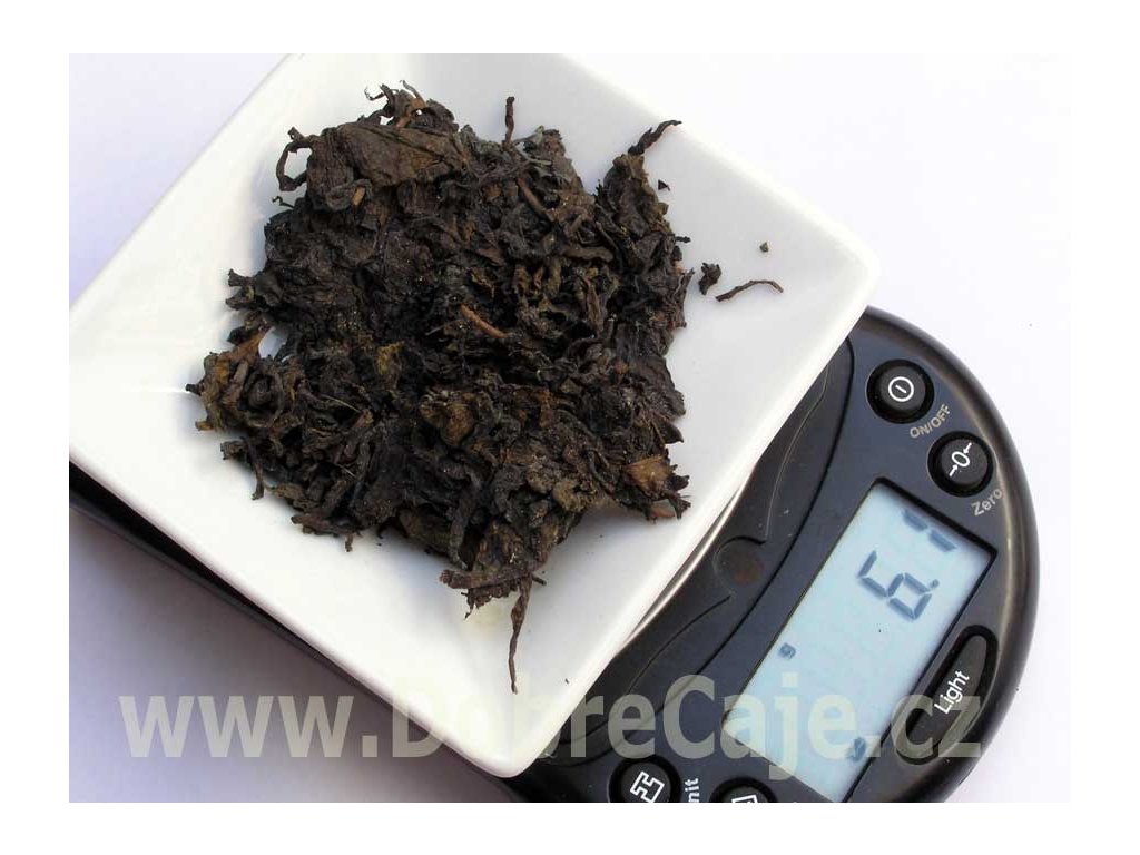 hmotnost (netto): 10 g (-5 %), resp dle dohody (čaj je rozřezán na kousky tvaru "puku" a každý kus má mírně jinou hmotnost, celková cena bude vypočítána dle skutečné hmotnosti vybraného kusu a vzájemně odsouhlasena (základní cena za 10 g je 369 Kč)