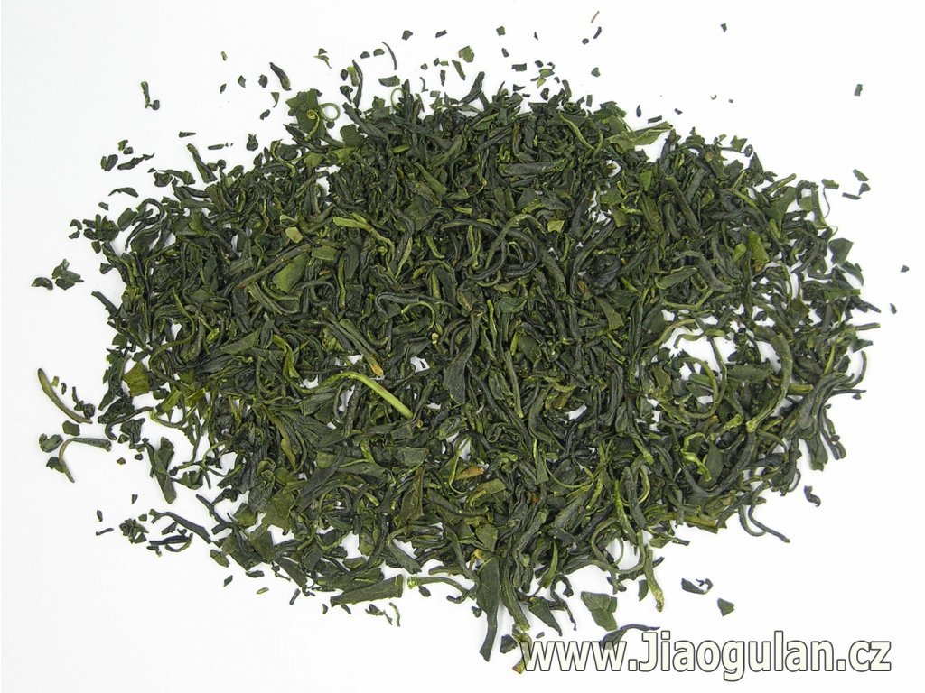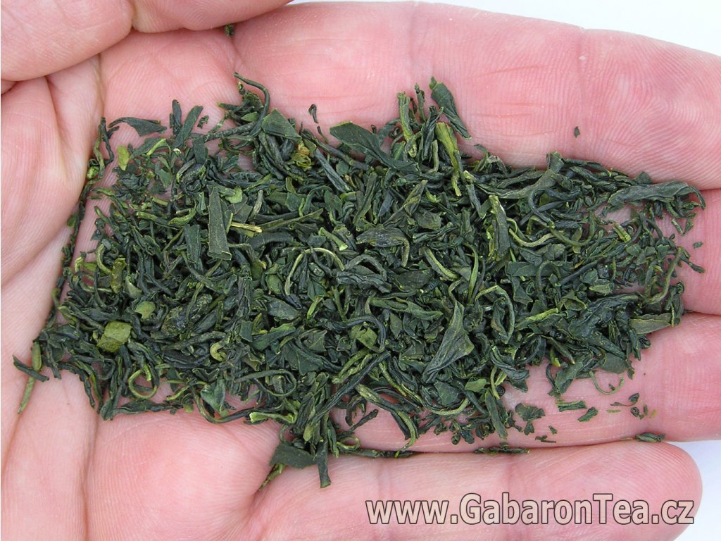 "japonský čaj z kultivaru čajovníku Yabukita zpracovaný čínským tradičním postupem - tvarováním na vyhřáté kovové pánvi (což prozrazuje nejen chuť a vůně, ale hlavně vzhled, tvar a barva lístků)"