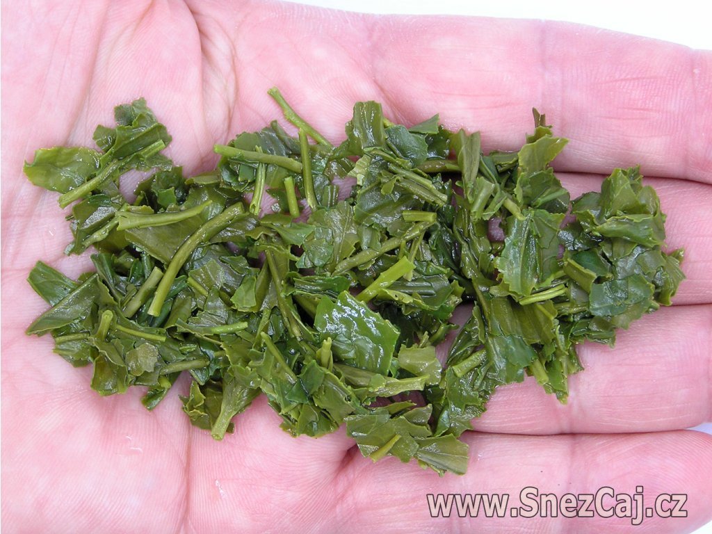 suchý čaj: hrubší nestejnoměrně rolovaný list tmavší zelené barvy, příjemné vůně připomínající vietnamské zelené čaje