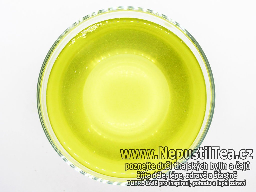 vyluhovaný čaj: měkký, svěže zelený, použitelný do salátu, jogurtu, smoothie apod.; s tóny pečené kukuřice a jedlých kaštanů