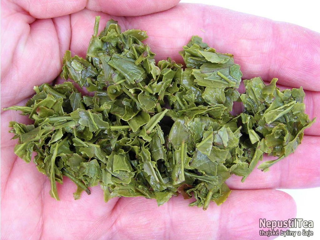 suchý čaj: voňavé, tmavě zelené lístky jehličkovitého vzezření