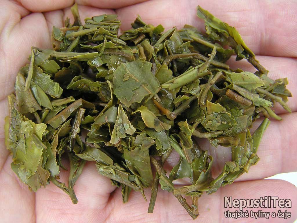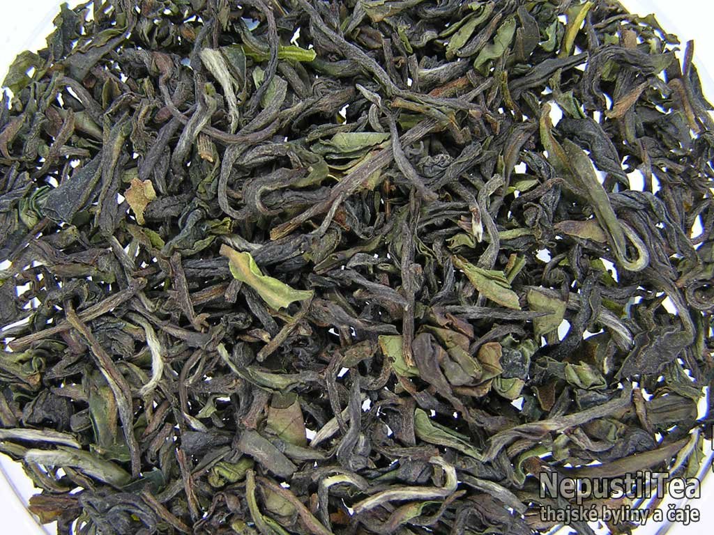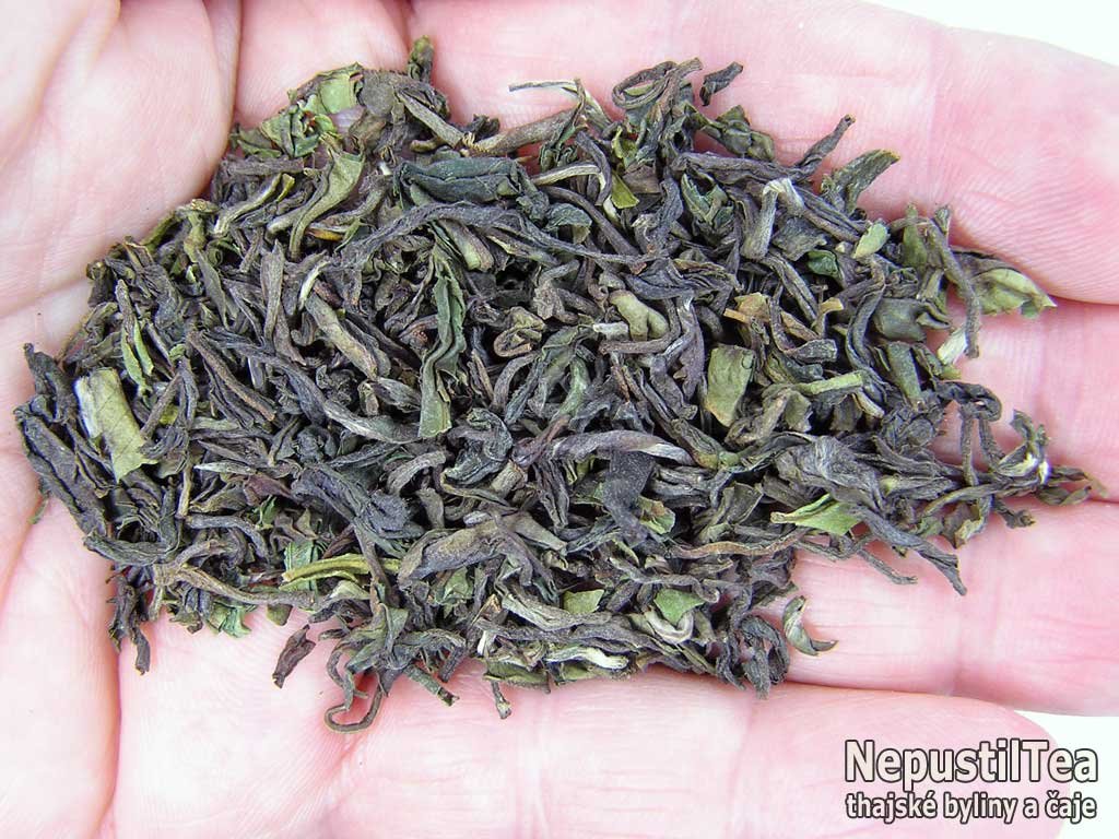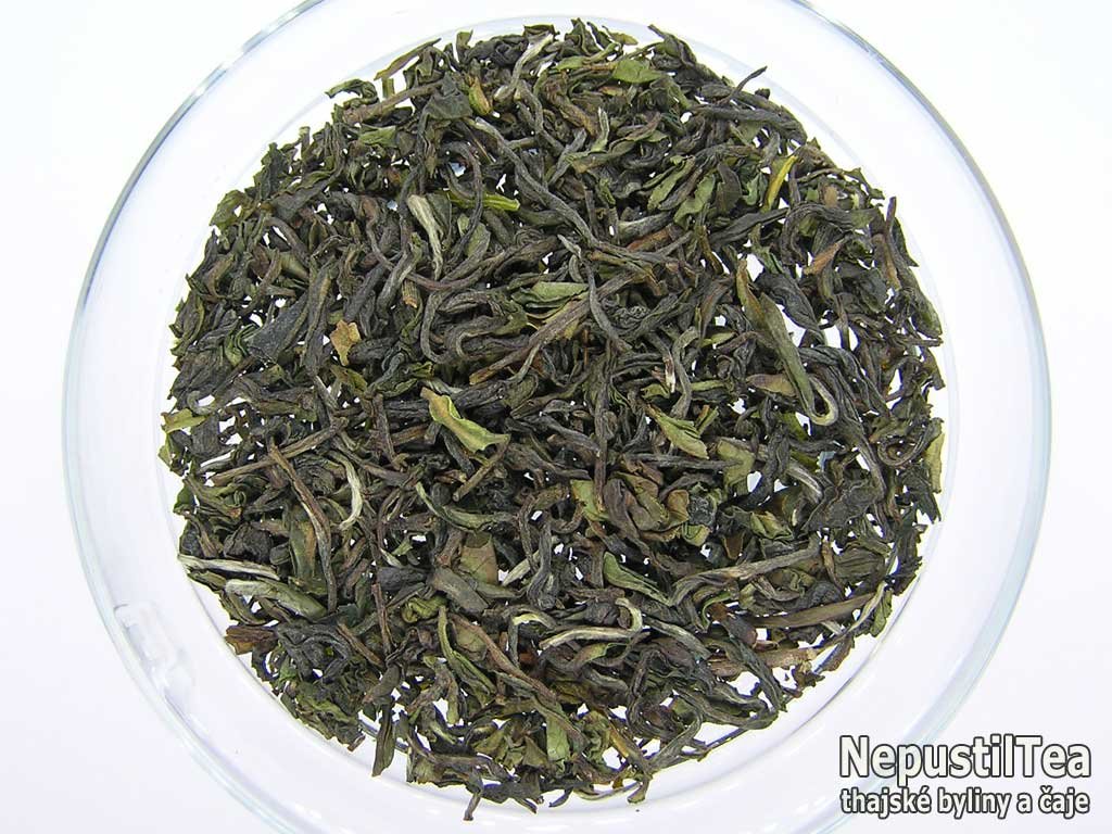 suchý čaj: lehce oxidovaný, středně dlouhý, tmavě zelený list s podílem tipsů.