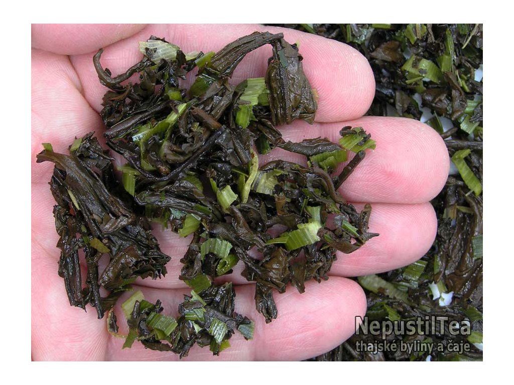 obr.: tmavý list čaje je smíchán se zelenými kousky listů pandánu