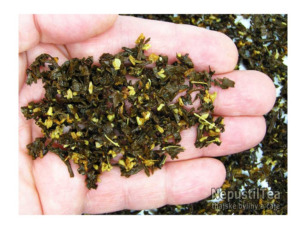 složení: 95 % čajovník pravý-list, 5 % osmanthus-květ (vonokvětka, lat. Osmanthus fragrance, "olivovník libovonný")