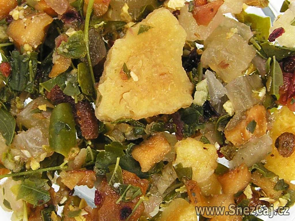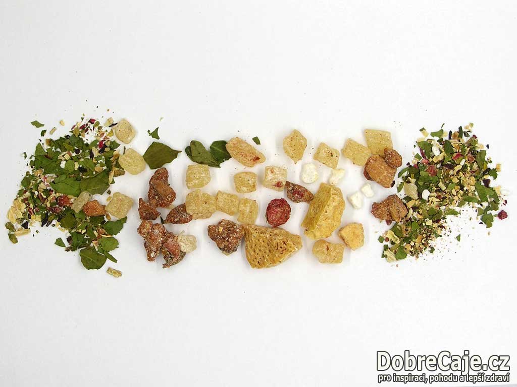 "vyvážený blend thajské moringy olejodárné (lat. Moringa oleifera), ananasu, limetky, hořkého melounu, jablka, lyofilizované pomerančové kůry, bez aromat a konzervačních látek; čaj přirozeně obsahuje velké množství minerálů, vitaminů (zejména vitamínu C), rostlinný růstový hormon zeatin; díky hořkému melounu má zajímavou osvěžující hořko sladko-kyselou chuť a benefity byliny; blend úžasně sladce voní a je bez kofeinu"