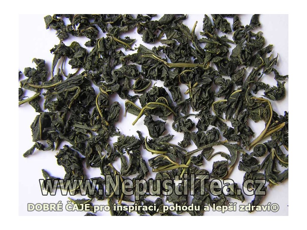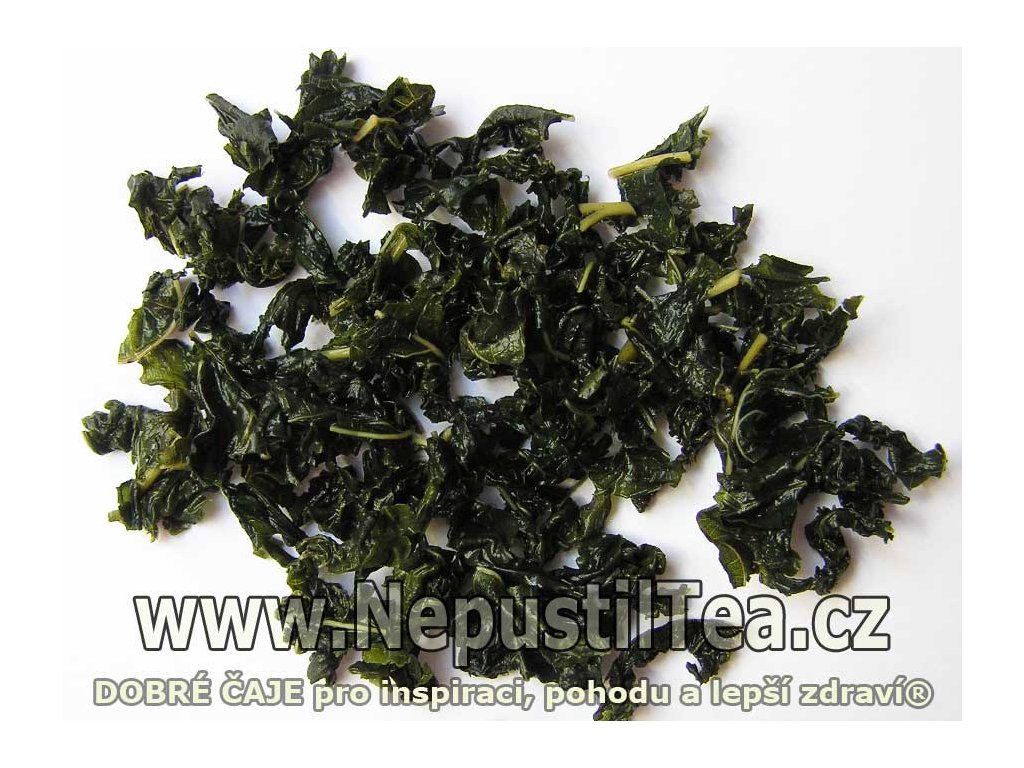 suchý čaj: rozřezaný rolovaný list zelené barvy, tuhý, příjemné nasládlé bylinné vůně