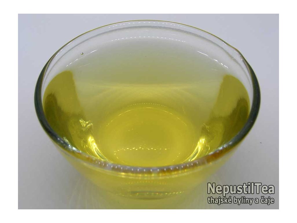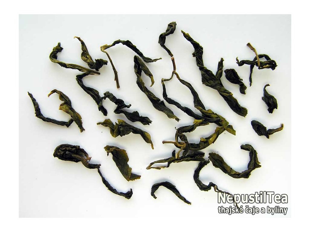 typ čaje a jeho složení, další označení: thajský polozelený čaj (oolong) velmi málo oxidovaný a podélně rolovaný typu "peo chung", 100% čaj pravý - konce flešů (vrcholových přírůstků větviček čajových keřů), Thai Green Oolong Tea, Thai Pao-Chung Tea